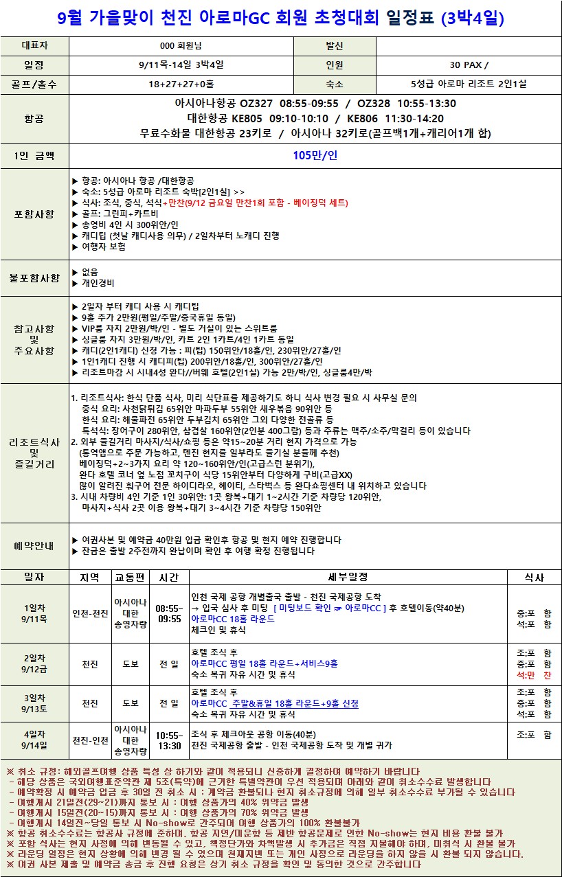 천진 회원제 아로마cc 9월 가을맞이 회원 초청 골프대회!!!