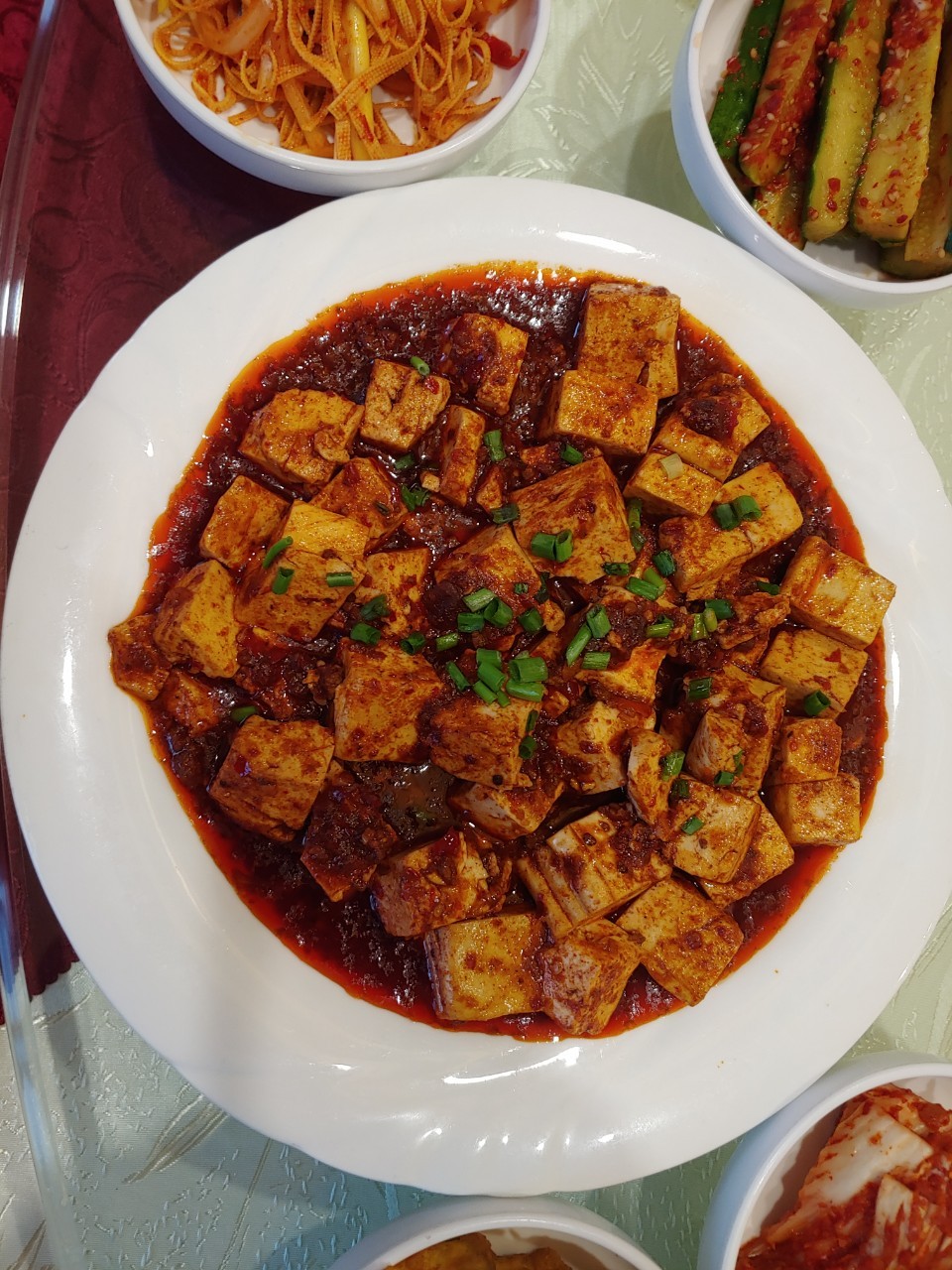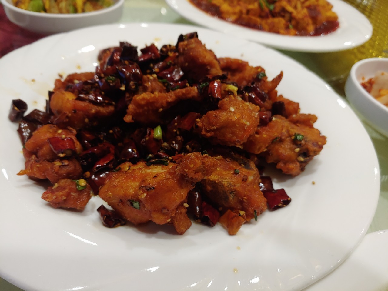 중식 요리: 사천닭튀김 65위안 마파두부 55위안 새우볶음 90위안 등