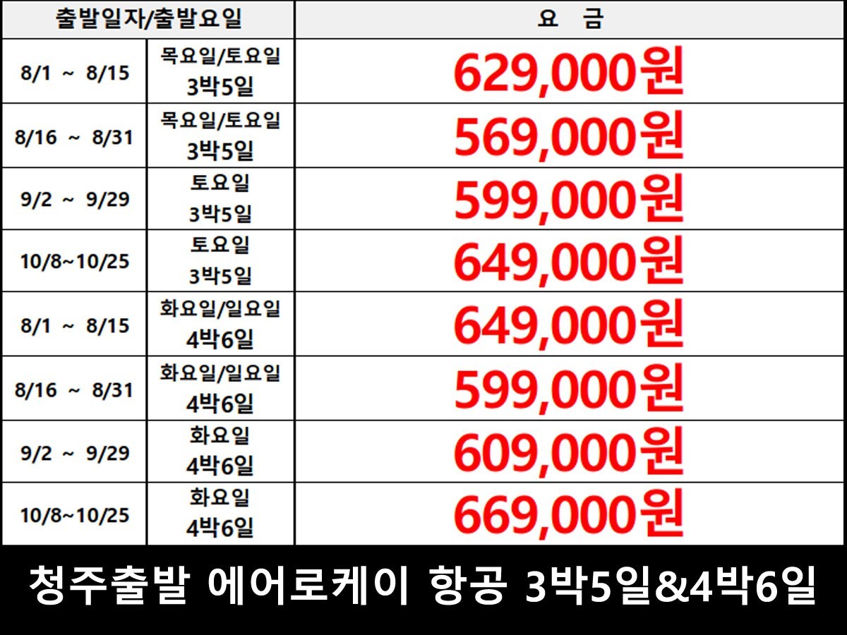 청주: 에어로케이 (3박5일/4박6일)