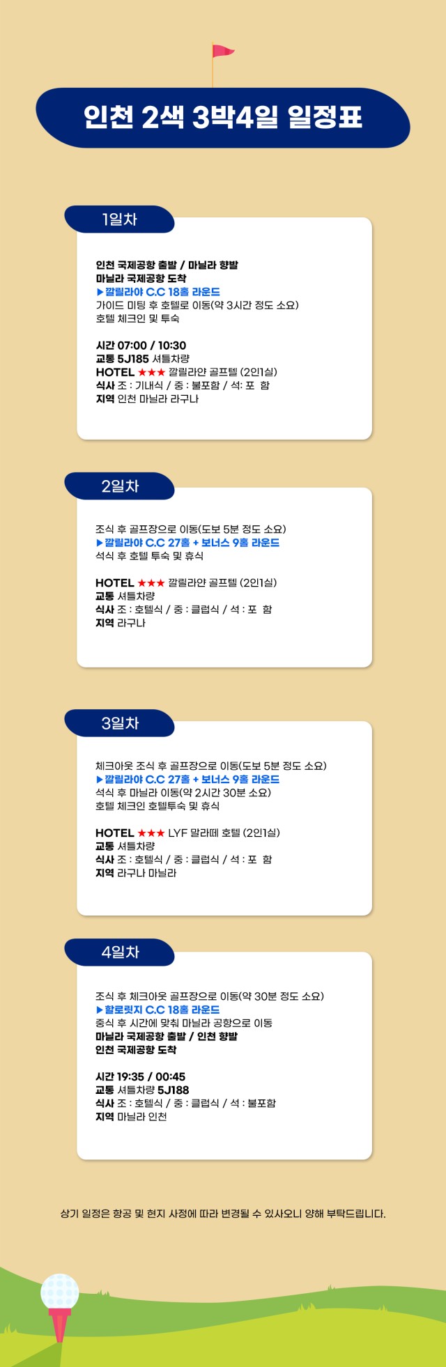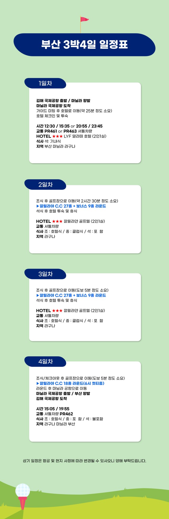 ● 현지 오후출발 항공편은 18홀 라운드를 제외시켜도 지상비는 동일합니다.