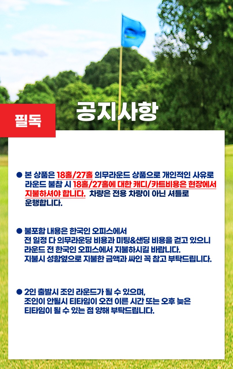 ● 본 상품은 18홀/27홀 의무라운드 상품으로 개인적인 사유로 라운드 불참 시 18홀/27홀에 대한 캐디/ 카트비용은 현장에서 지불하셔야 합니다. 이점 양해해 주시기 바랍니다.