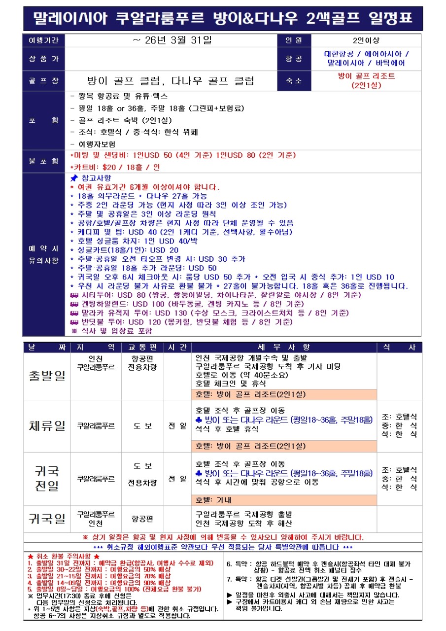 * 주말·공휴일 오전 티오프 변경 시: USD 30 추가
