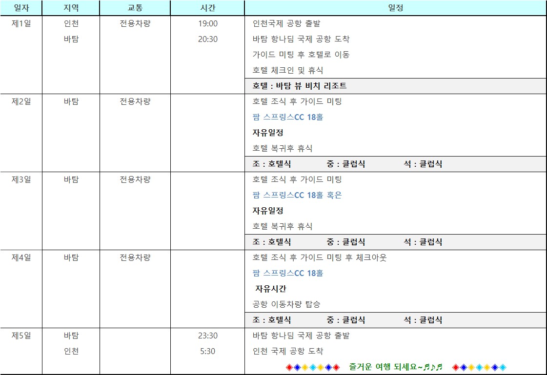 - 패키지 상품이므로 라운드 및 식사, 포함된 일정을 진행하지 않아도 환불되는 금액이 없습니다. (천재지변, 우천 등도 불가)