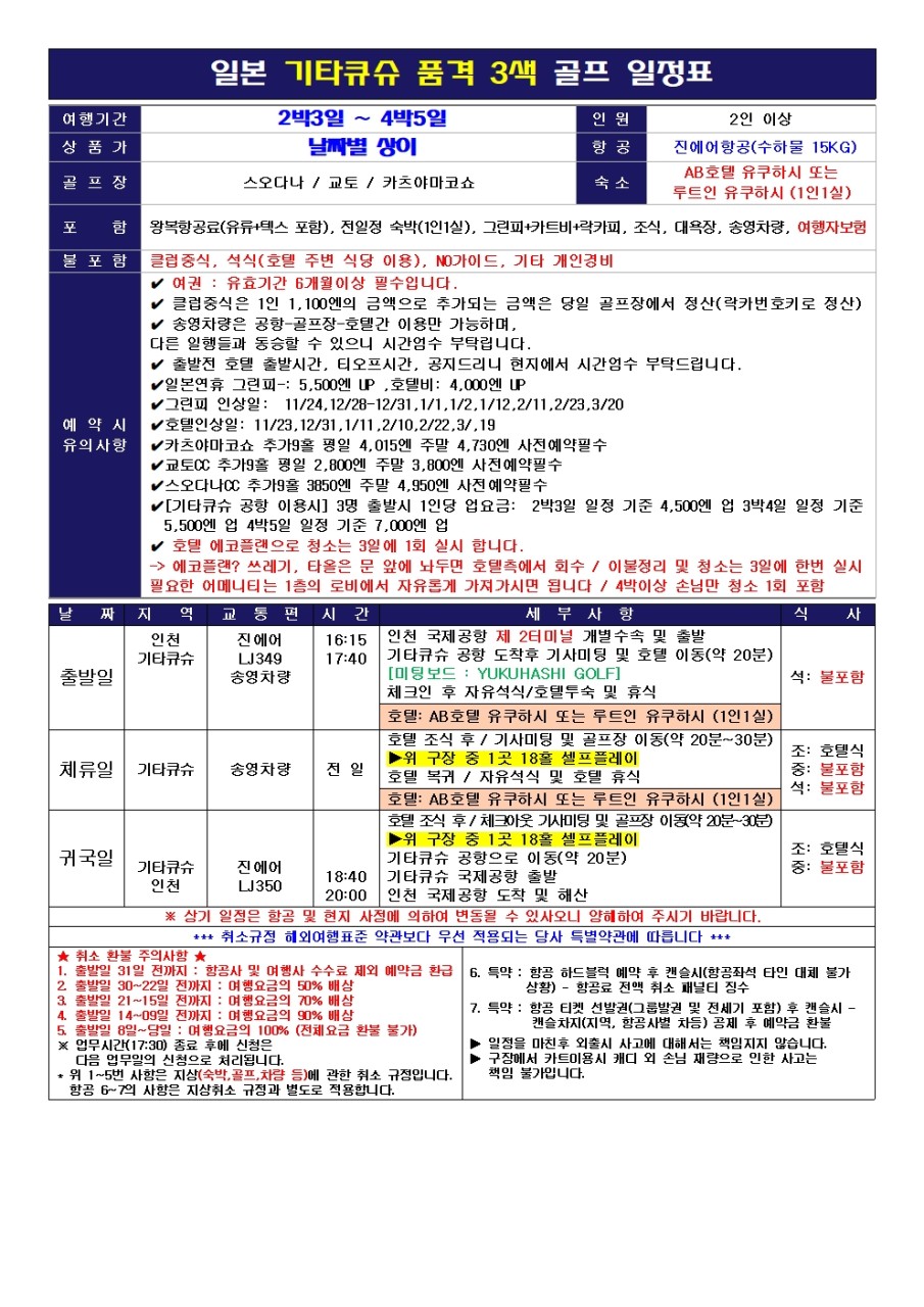✔️[기타큐슈 공항 이용시] 3명 출발시 1인당 업요금: 2박3일 일정 기준 4,500엔 업 3박4일 일정 기준 5,500엔 업 4박5일 일정 기준 7,000엔 업