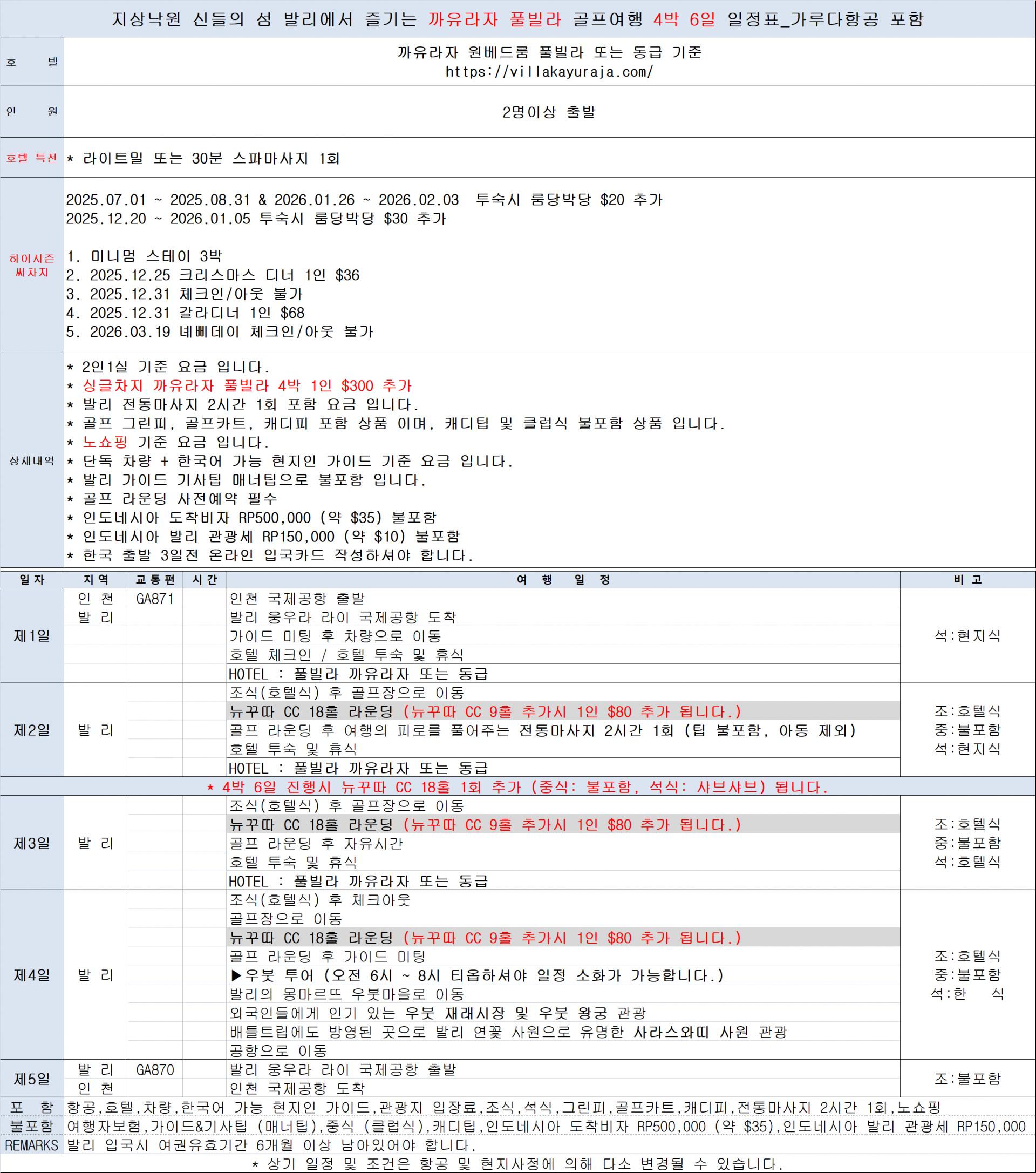 * 뉴꾸따 CC 9홀 추가시 1인 $80 추가