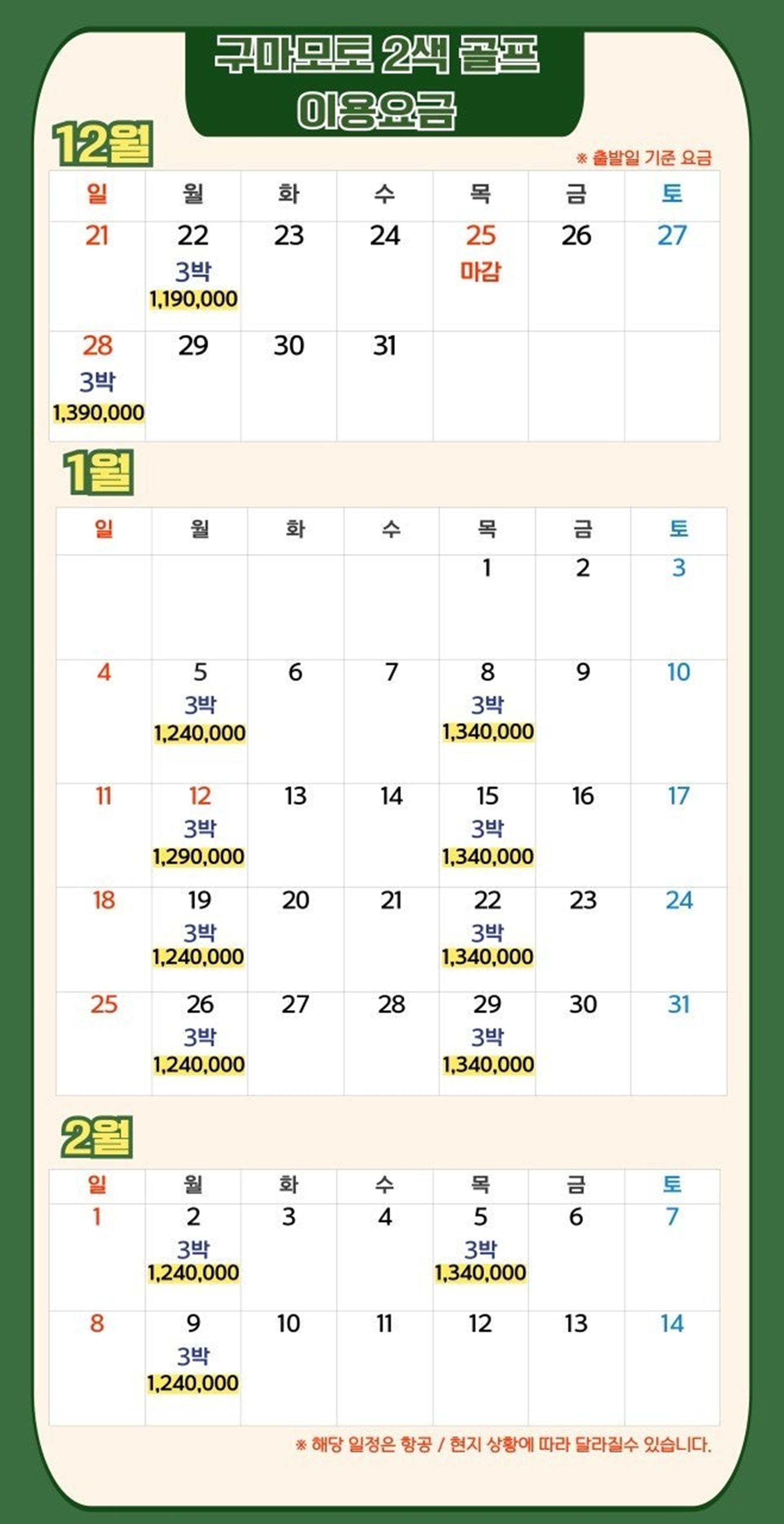 ※ 세부 날짜별 최종 잔여석 및 요금은 예약 시 재확인 필수