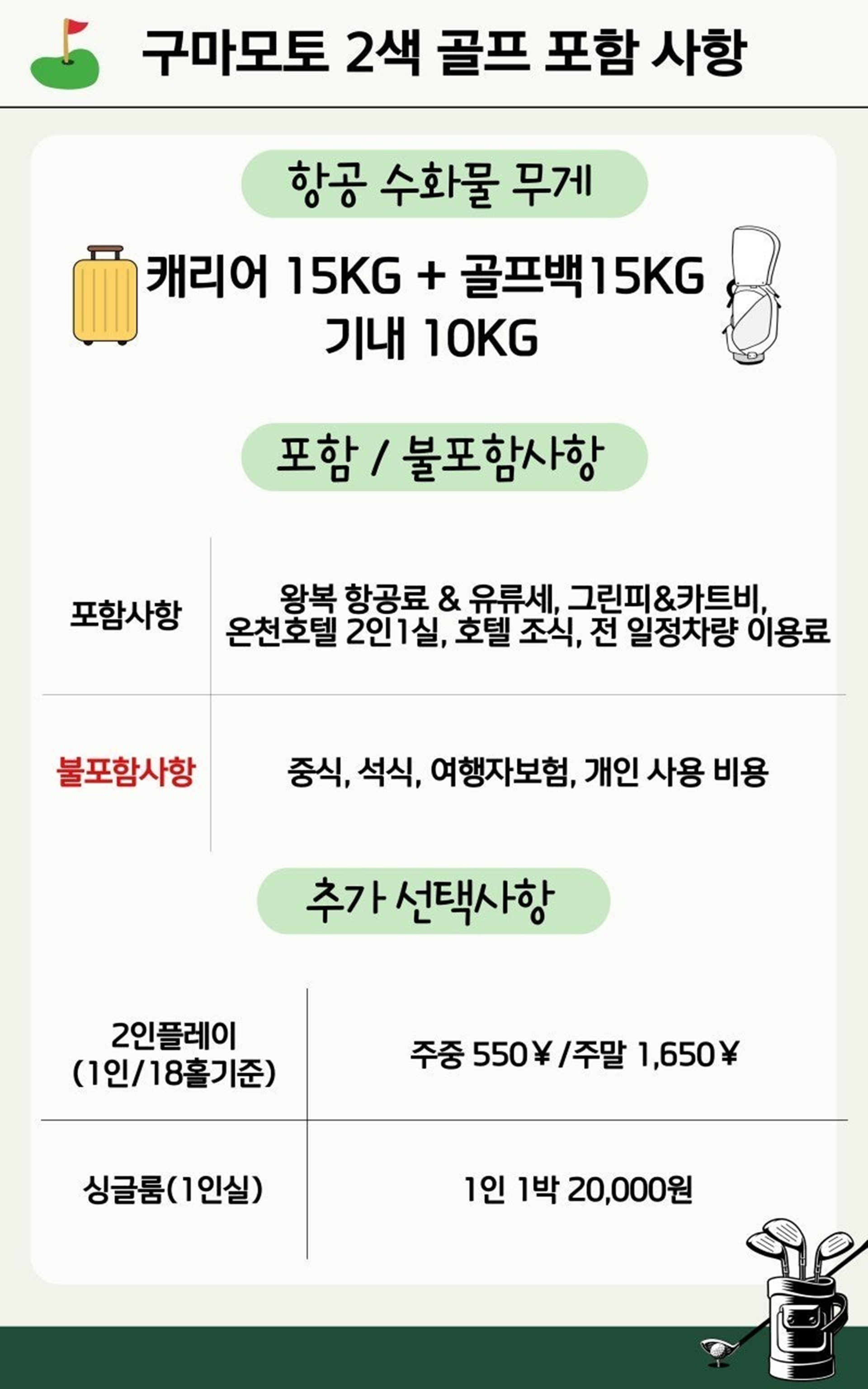 💼 넉넉한 수하물: 캐리어 15kg + 골프백 15kg + 기내 10kg